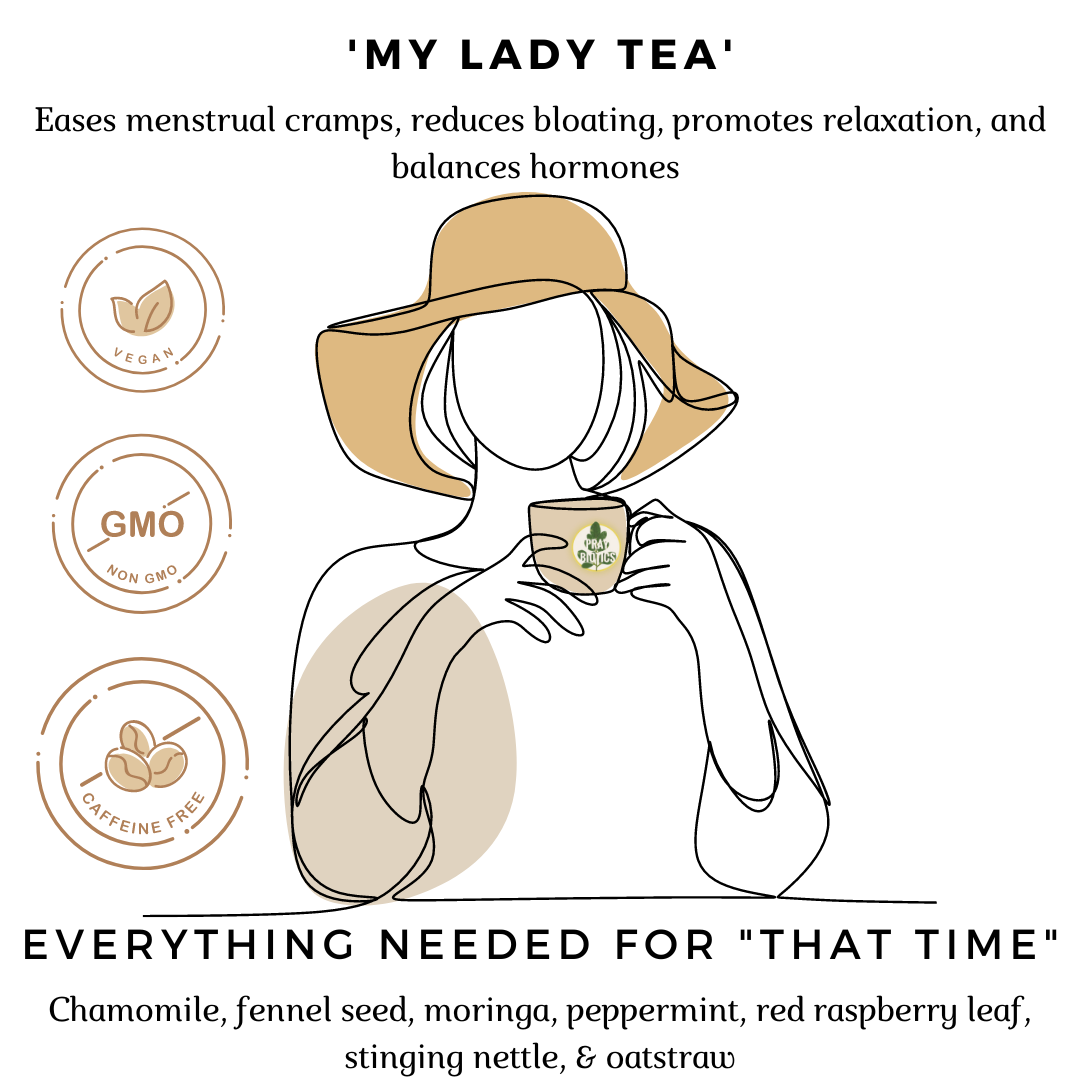 My Lady Menstrual Tea is a refreshing and delicious full-flavored blend suitable for everyday use, but perfect for use before and during the monthly menstrual cycle. My Lady Tea is a handcrafted herbal blend designed to help regulate the menstrual cycle and alleviate those pesky symptoms of PMS. This blend eases menstrual cramps, reduces bloating, promotes relaxation, and balances hormones. With consistent use, a more regulated cycle can be attained.